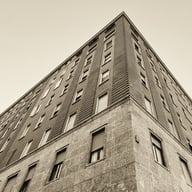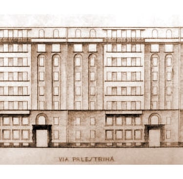 Il Basamento in pietra: I primi due piani fuori terra sono interamente rivestiti in materiale lapideo naturale (pietra). Questo zoccolo in pietra massiccia dà un senso di stabilità e monumentalità, tipico dell'architettura razionalista degli anni '30.