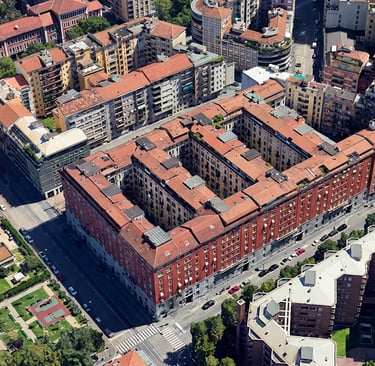 La Facciata in cotto (il "Rosso"): Dal terzo all'ottavo piano, l'intera facciata esterna è rivestita in mattoncini in cotto. È proprio l'uso intensivo di questo laterizio a vista a conferire all'edificio quel colore rosso acceso e omogeneo che gli è valso il celebre soprannome. I mattoncini creano una trama compatta e continua lungo tutto l'isolato.